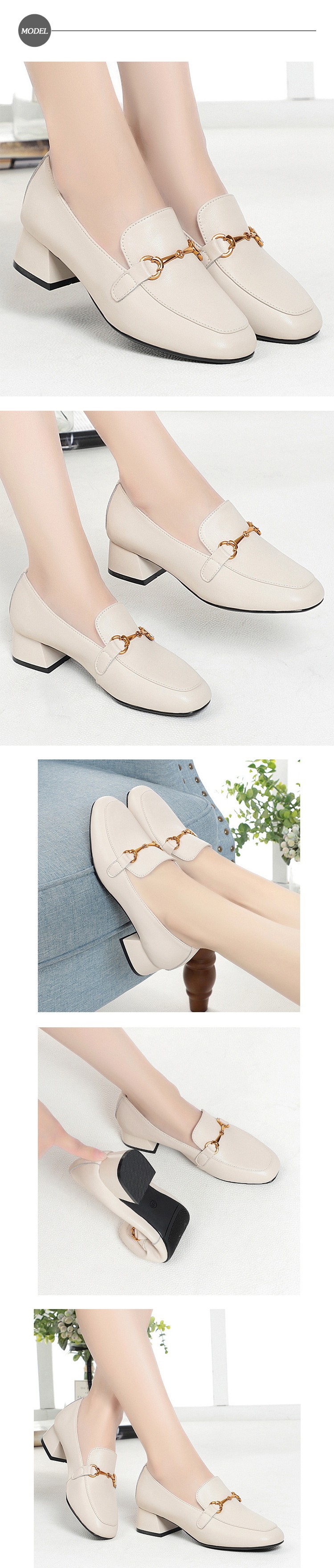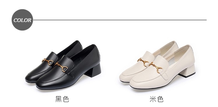 【MOM】樂福鞋 粗跟樂福鞋/真皮馬銜釦飾小方頭粗跟樂福鞋 米