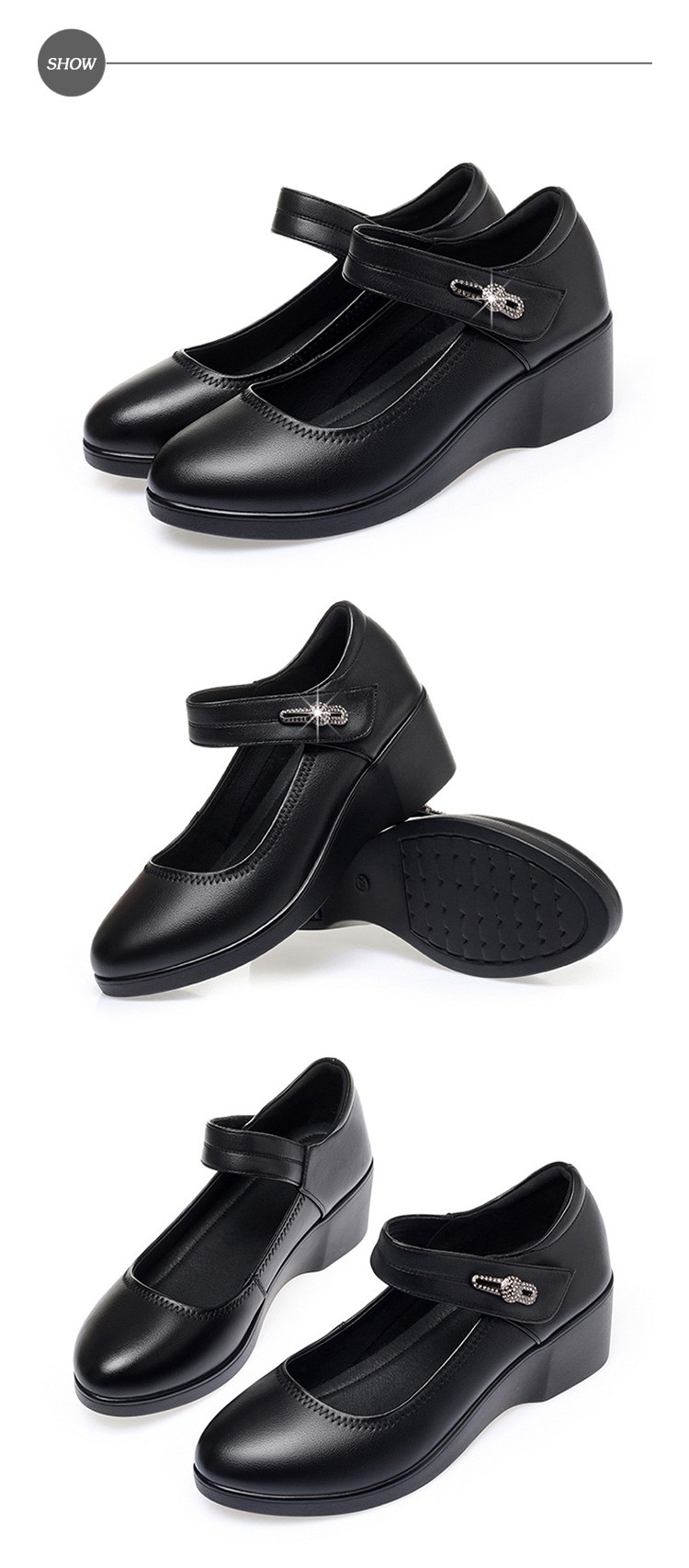 【MOM】娃娃鞋 坡跟娃娃鞋/真皮小圓頭淺口美鑽別針圓釦裝飾魔鬼粘坡跟娃娃鞋 黑