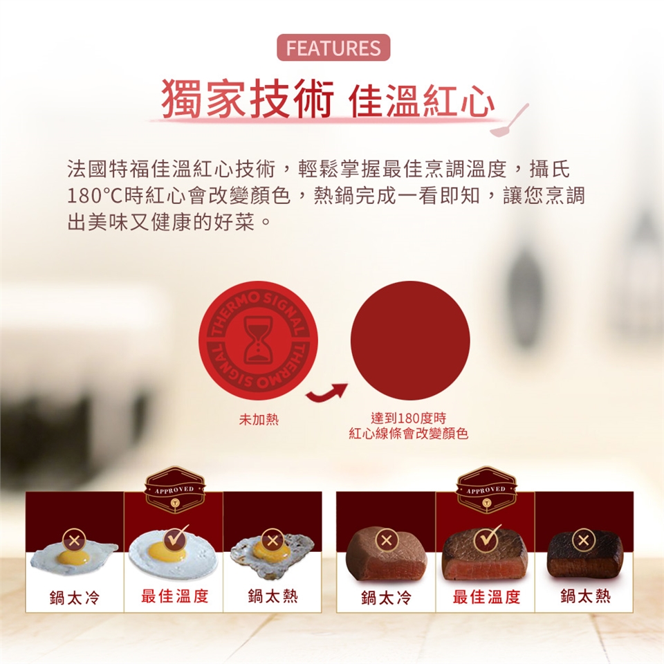 輕鬆掌握最佳烹調溫度,攝氏180℃時紅心會改變顏色,熱鍋完成一看即知。