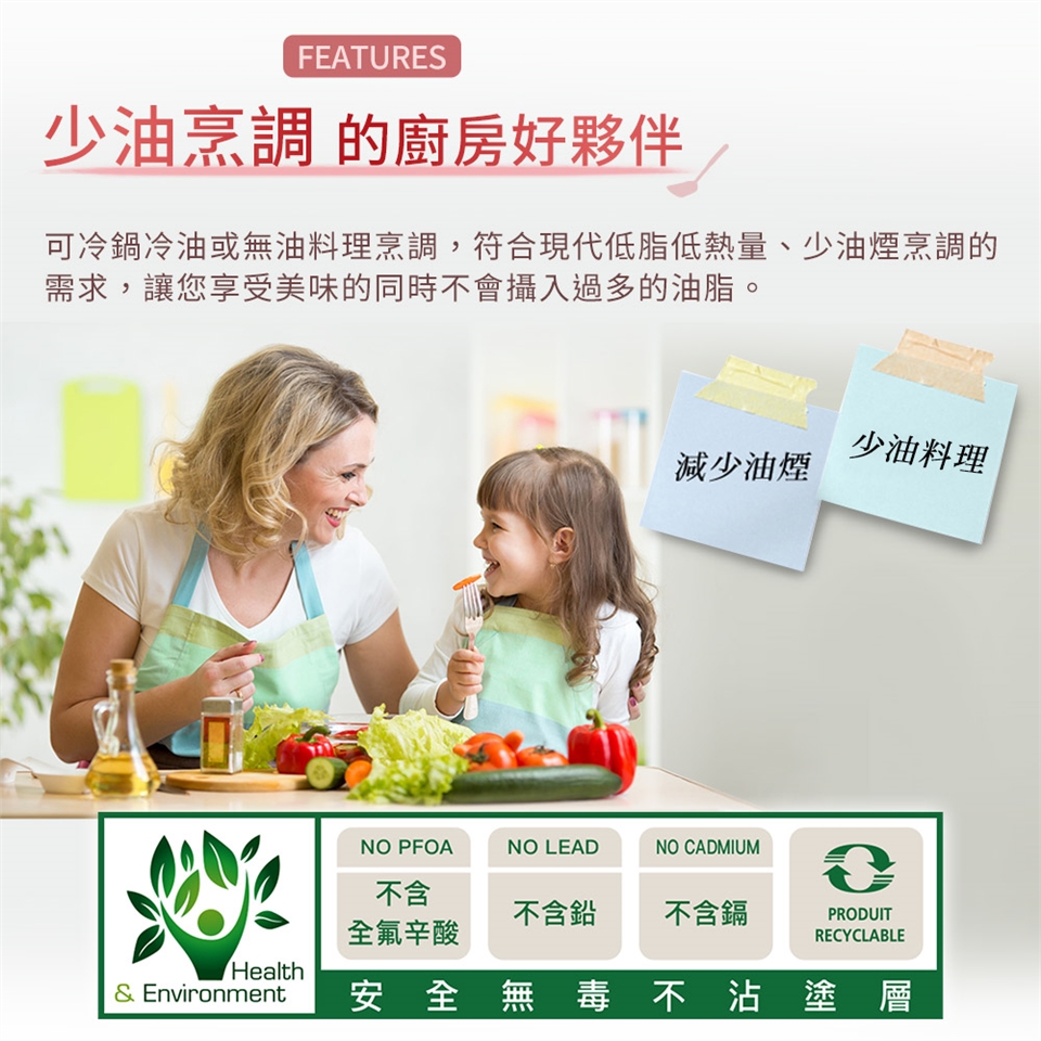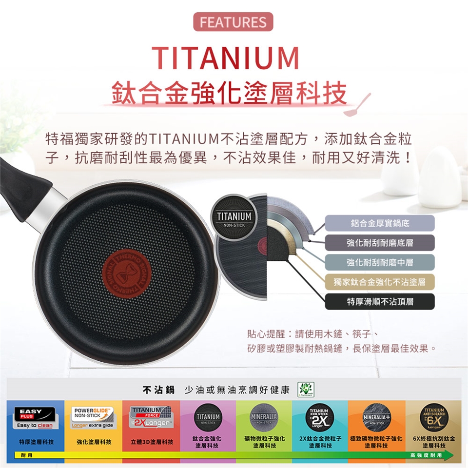 獨家研發,添加鈦合金粒子,抗磨耐刮性最為優異,不沾效果佳又好清洗!