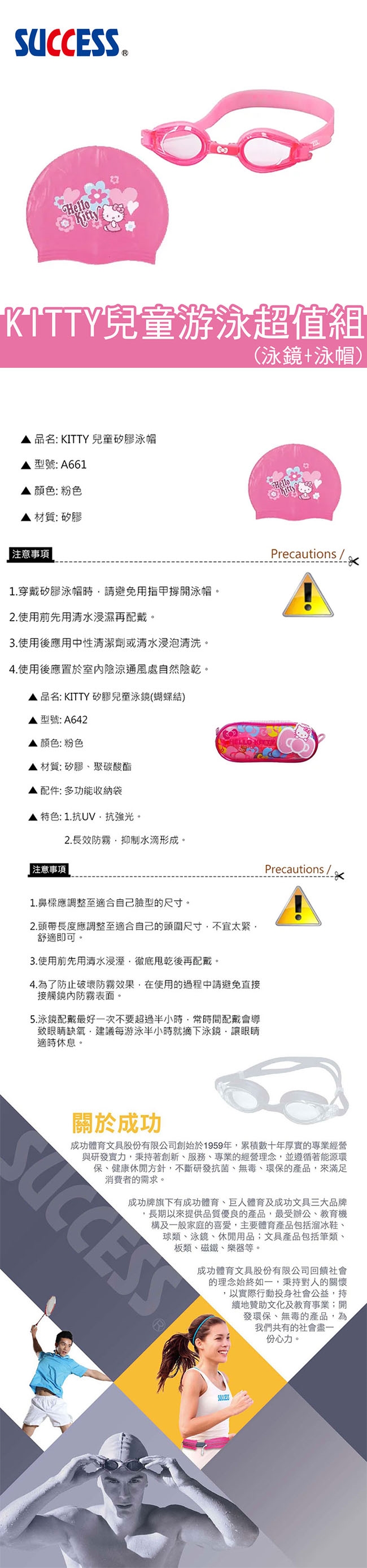 成功 KITTY兒童矽膠泳鏡+泳帽超值組 A661+A642正版授權