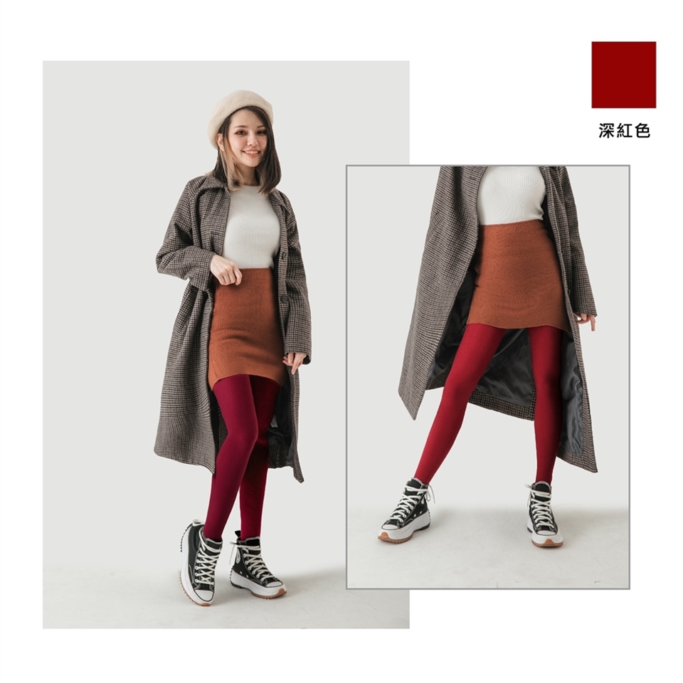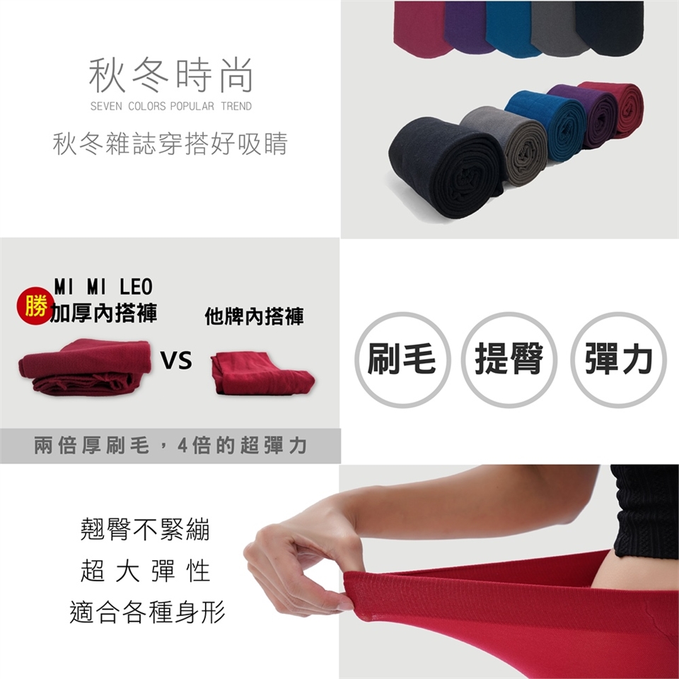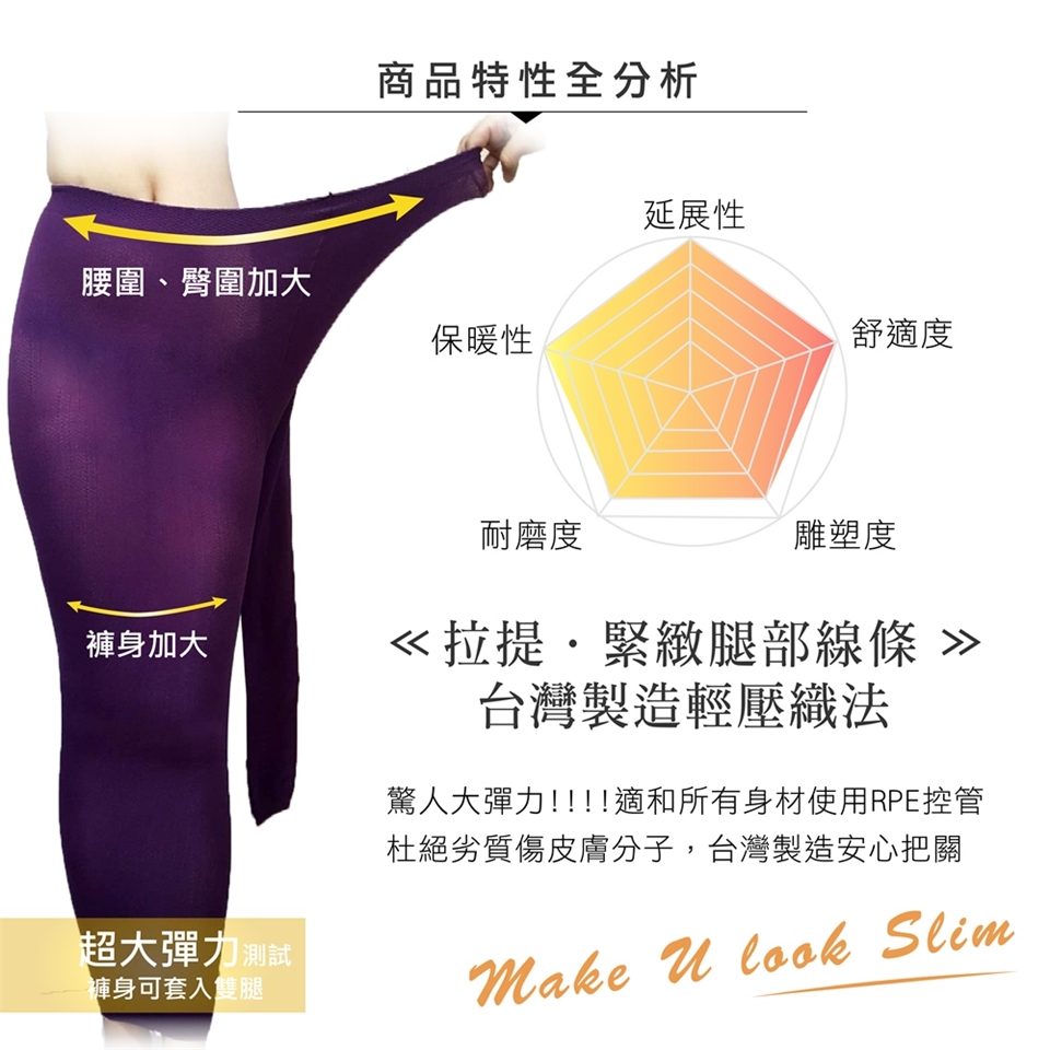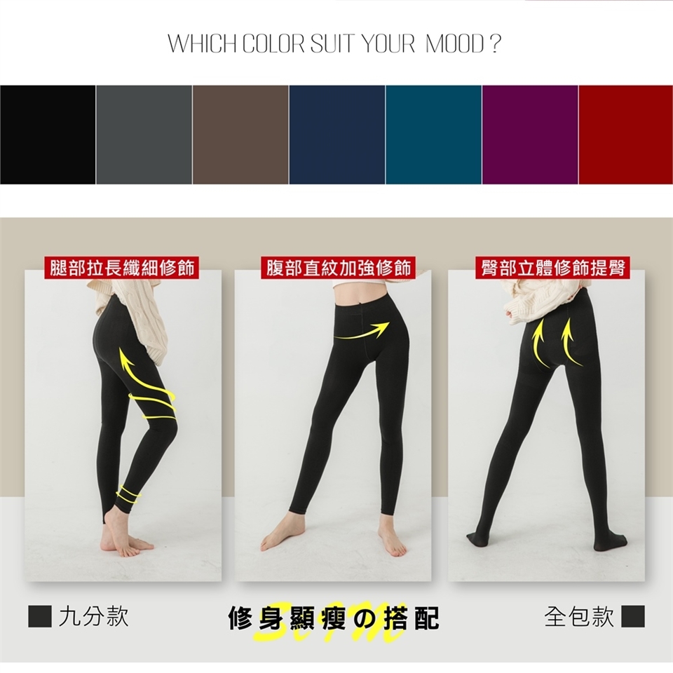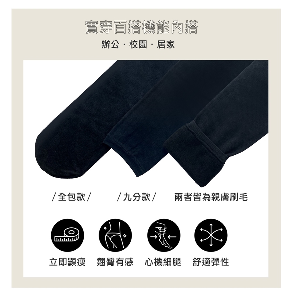 均勻伸展至腰部,確定內搭褲與腿部緊貼無間隔後,以雙手將褲身部分撐開,並將其拉上至腰間。 將褲腿部分稍作調整。 穿著完畢後,輕拉腳尖部份,使彈性分布更均勻。 如果覺得褲襠不夠長,應退下重穿,切勿一味往上拉。