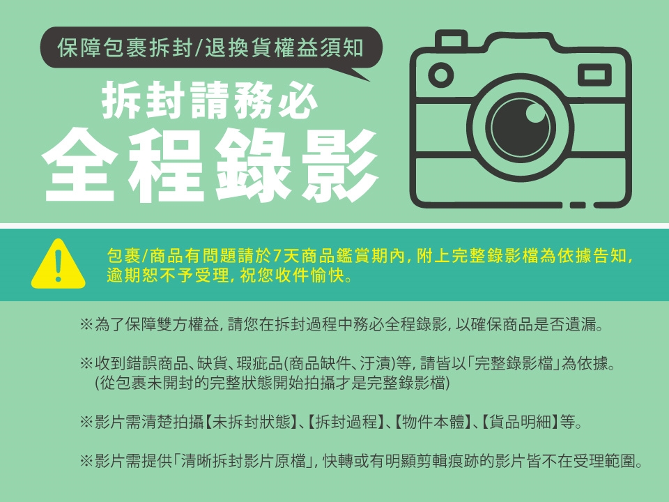 .為了保障雙方權益,請在拆封過程中務必全程錄影,以確保商品是否遺漏、缺貨、瑕疵品(商品缺件、汙漬)等,包裹/商品有問題請於7天商品鑑賞期內,附上完整錄影檔為依據告知,逾期恕不予受理!