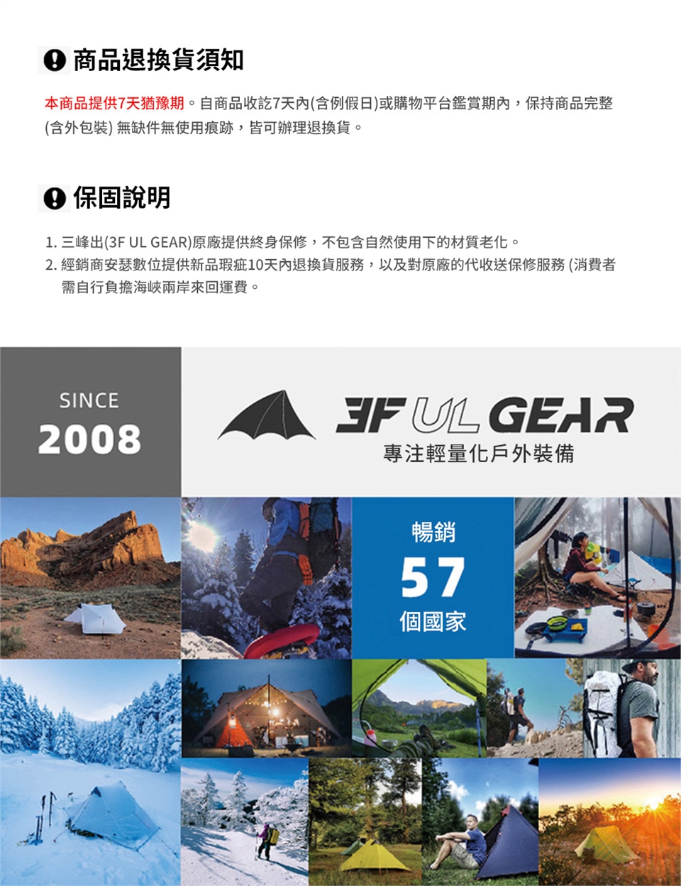 1. 三峰出(3F UL GEAR)原廠保固一年及終身保修,不包含自然使用下的材質老化。