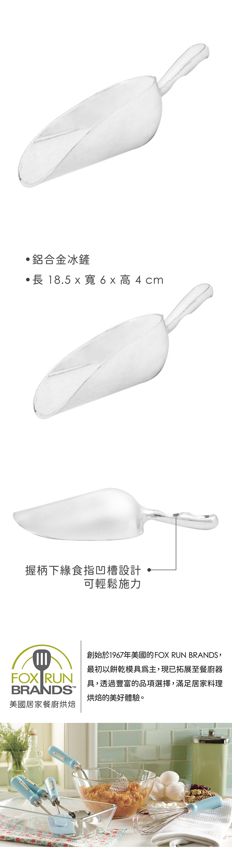 調製飲品、雞尾酒時,需要添加冰塊來增加沁涼度,推薦您此款鋁合金冰鏟。杓狀鏟冰面搭配握柄下方指腹凹槽設計,協助您輕鬆施力,可舀取家中白米、麵粉、五穀雜糧等食材;或挖取寵物飼料,重量輕巧好拿握。