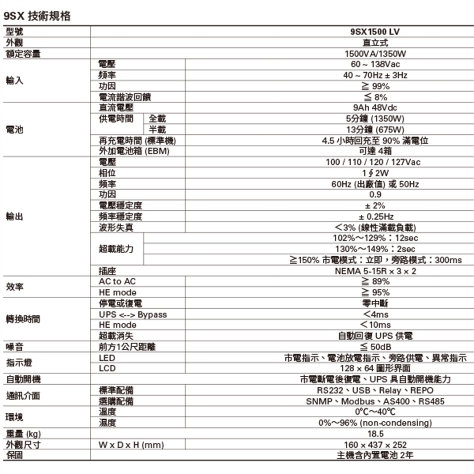 伊頓 9SX UPS 結合可靠的雙重轉換拓撲、內部靜態旁路及易於讀取的LCD 選單顯示器,以便利的直立式外型,提供高效可靠的電源,滿足您對 9 系列 UPS 的期望。網路、Modbus、繼電器及訊號輸入功能,可整合至各種物聯網及工業物聯網應用。