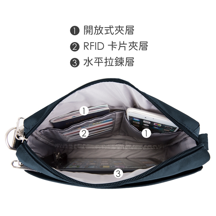 ※ 具包前水平拉鍊層、主袋拉鍊層、包後拉鍊層各 x 1;主袋拉鍊層內含水平拉鍊層 x 1、開放式夾層 x 2、RFID 卡片夾層 x 3。