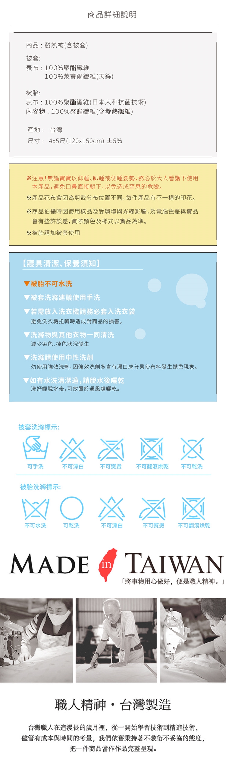 被套 : 可手洗、不可漂白、不可熨燙、不可翻滾烘乾、不可乾洗。