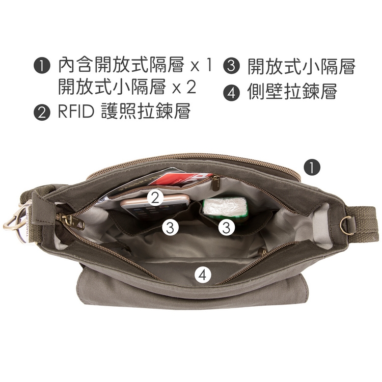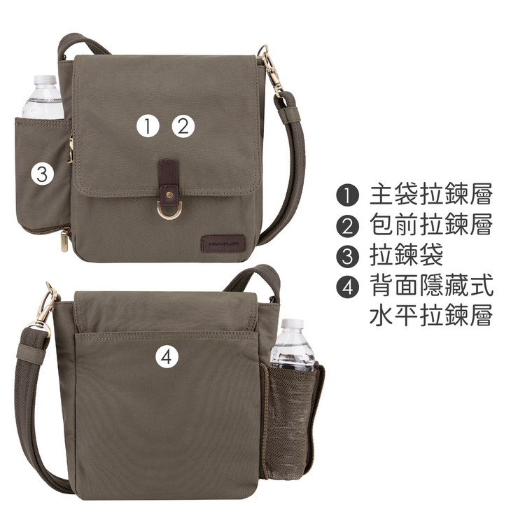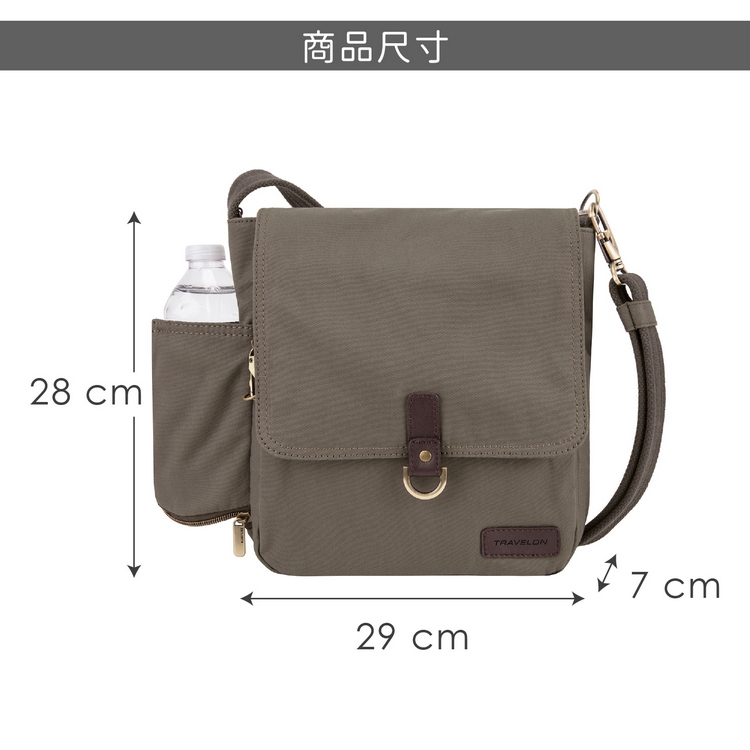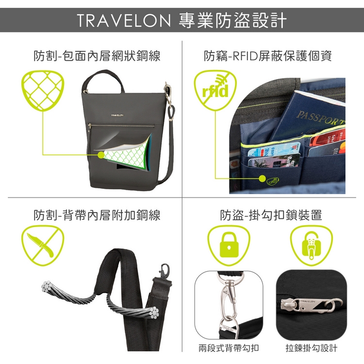 TRAVELON 防盜包面內含防割鋼線,交叉編織形成防護網,防止扒手近身割破;背帶採防割設計且可調整長度,並可拆卸扣鎖於椅背以防偷竊;拉鍊鎖頭防盜裝置,防護加倍更安心。包前拉鍊層內含開放式隔層 x 1、開放式小隔層 x 2;背面隱藏式水平拉鍊層 x 1;主袋拉鍊層內含開放式隔層 x 1、側壁拉鍊層 x 1、側壁護照拉鍊層 x 1 (具 RFID 屏蔽防護功能)、開放式小隔層 x 2;包外一側可收納水壺、雨傘。RFID 屏蔽防護有效阻絕未經允許的個資讀取,避免隨身晶片卡、門禁卡資料被有心人士截取破解、盜刷。以牛皮及黃銅色配件做搭配,不僅實用更顯個性。