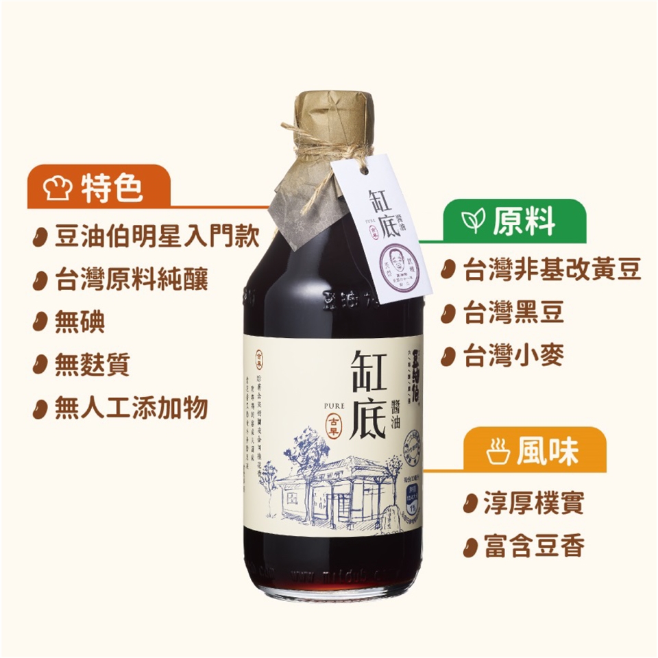 •醬油為原豆發酵製成,故含有天然油脂浮於液面,瓶身若有沈積痕跡屬自然現象,品質不便請安心食用。