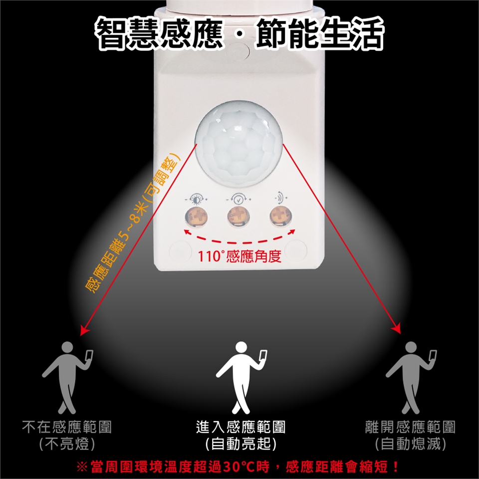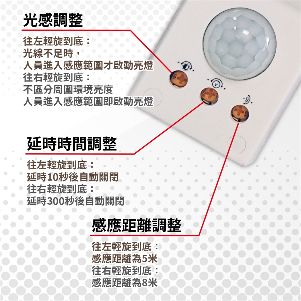 範圍鈕:輕扭至(+)符號,感應範圍為8米;輕鈕至(-)符號,感應範圍為5米。