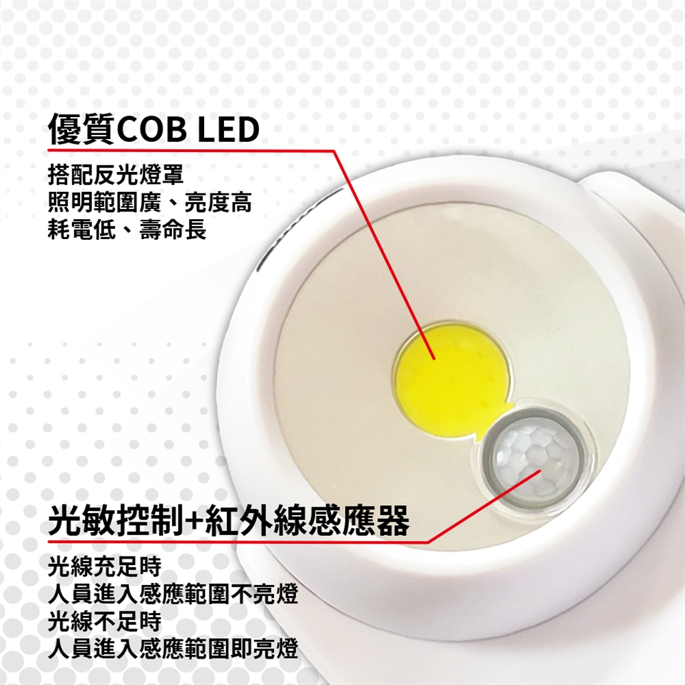 在光線不足環境下感應亮燈,在燈未熄再次感應或持續有動作,即使周遭環境光線即時補足,亮燈感應會持續延長。