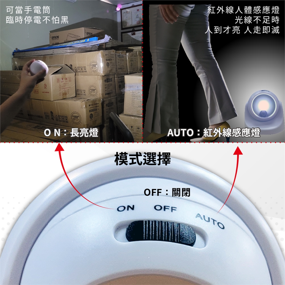 AUTO:人體感應-內置光控感應器,自動辨別白天或夜晚狀態,白天自動待機,夜晚感應亮光,有效的避免白天開浪費,人來即亮,離開延時關閉。