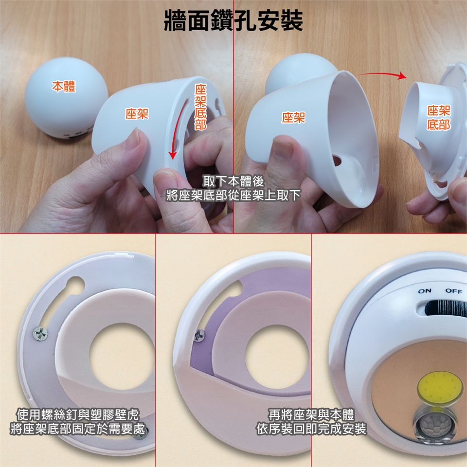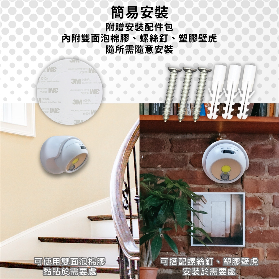 附有座架以及螺絲釘+塞孔帽與雙面膠泡棉可放於地上、置於桌面或安裝於壁面和天花板上自由運用。