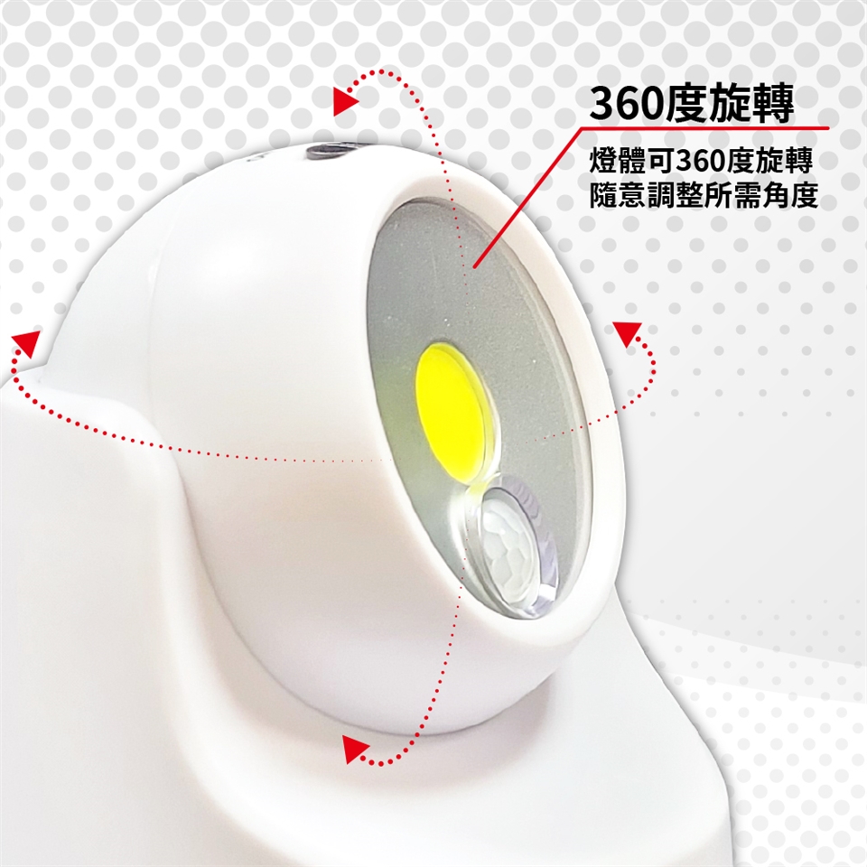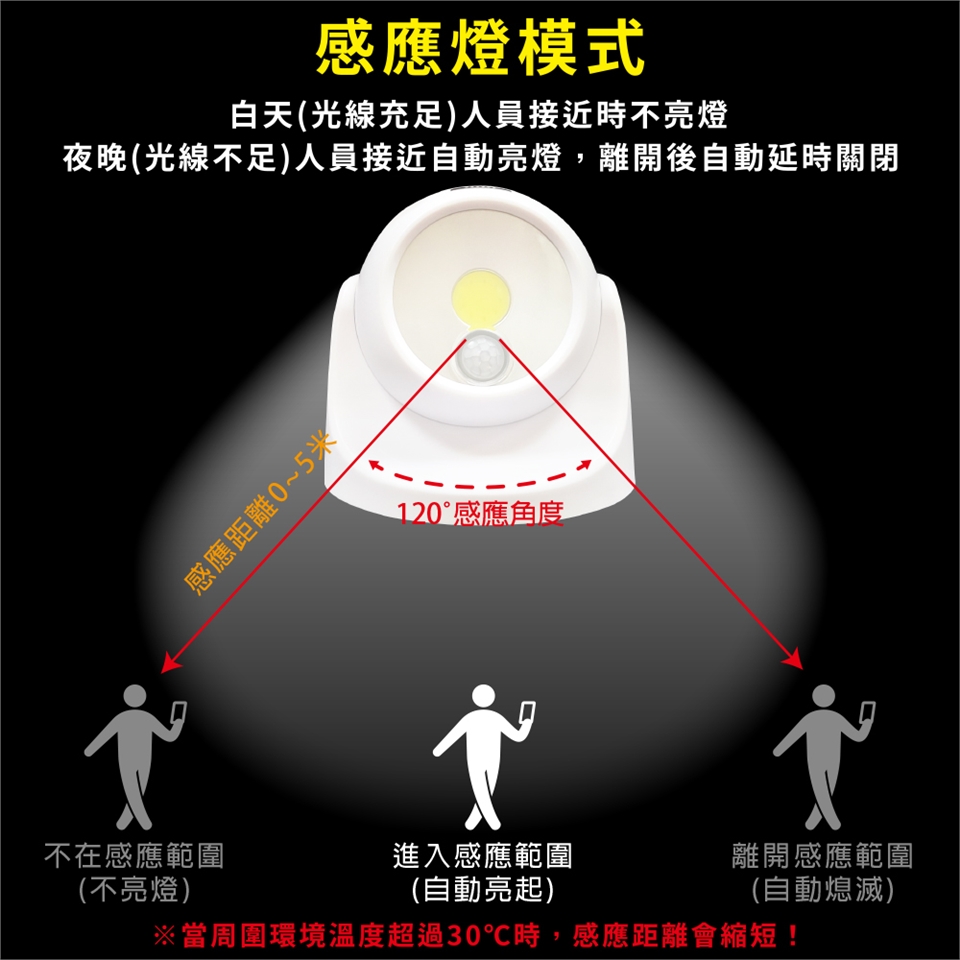 當光線不足時,人於左右約120度(左右約60度)範圍內移動,LED燈自動亮起,感應亮燈時間約30秒±5秒。
