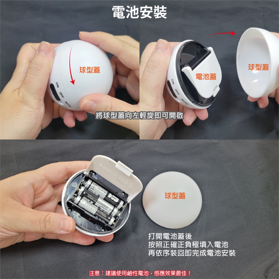 電池請正確填入正負極,長時間不使用請取出電池以免漏液導致本體損傷。