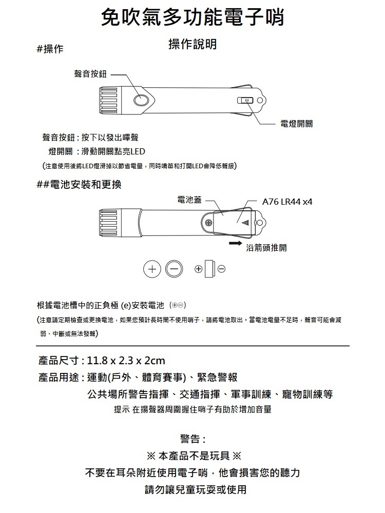 *本產品不是玩具,不要在耳朵附近使用電子哨,他會損害您的聽力,請勿讓孩童獨自玩耍或使用。