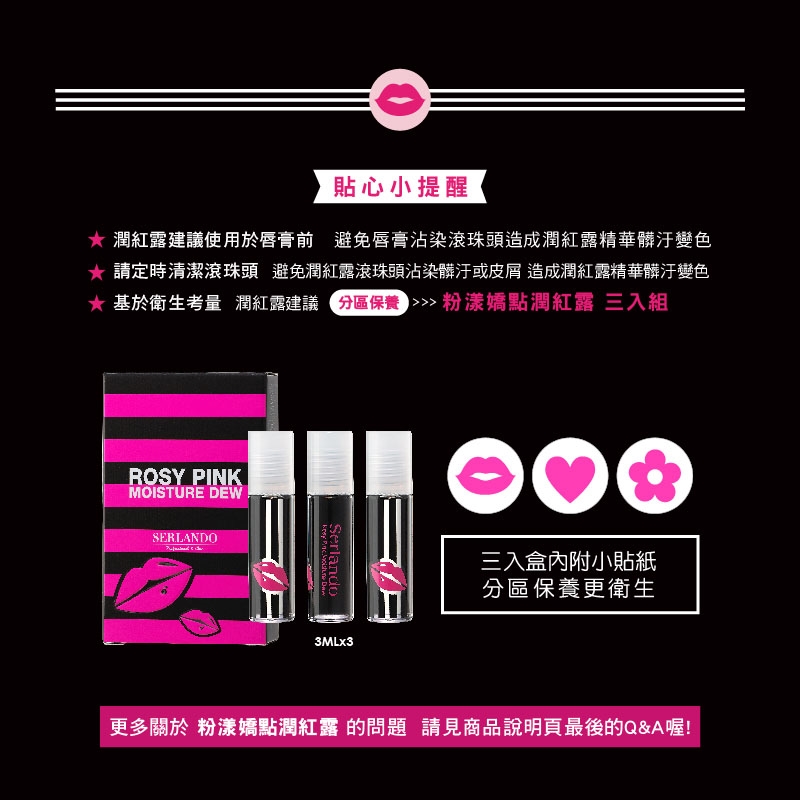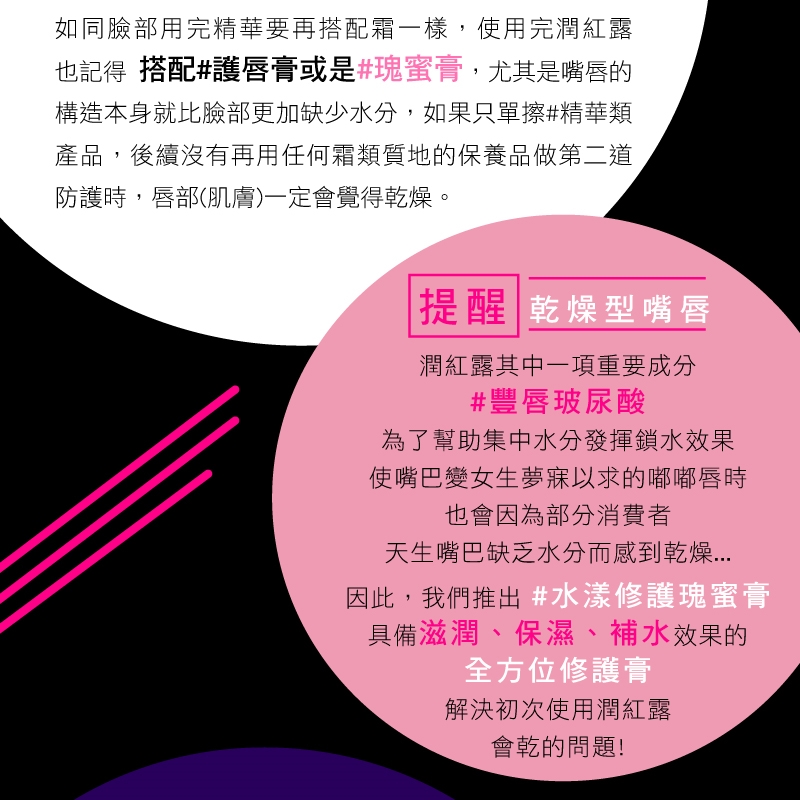 1. 使用前請清潔雙唇 - 因潤紅露為滾珠設計,為避免滾珠塗抹時將唇上的雜質帶入瓶身,造成精華液混濁、變色等情況。