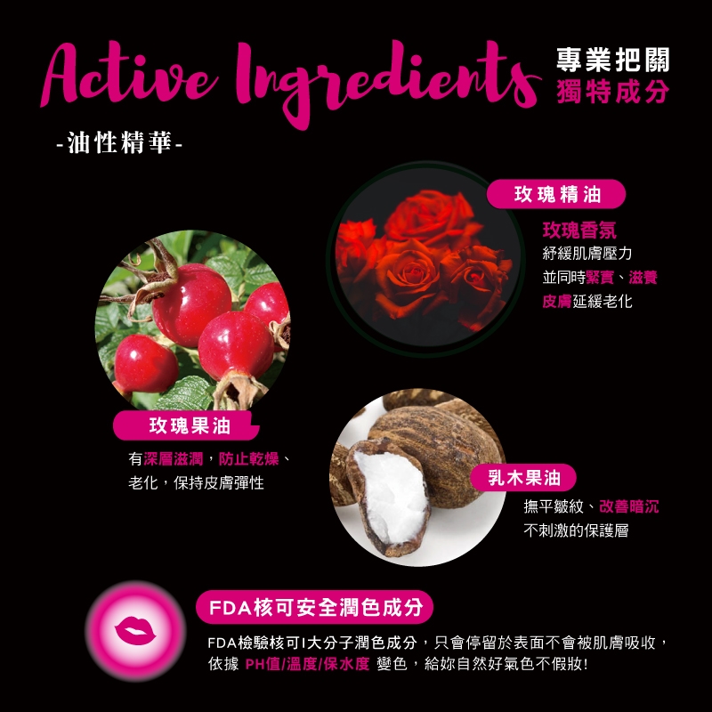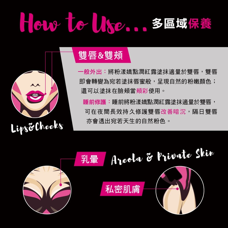 3. 因潤紅露為精華油,若使用於乳暈、私密肌膚等部位,請待其吸收並用衛生紙按壓確認後再穿上衣物,避免沾染您的貼身衣物。