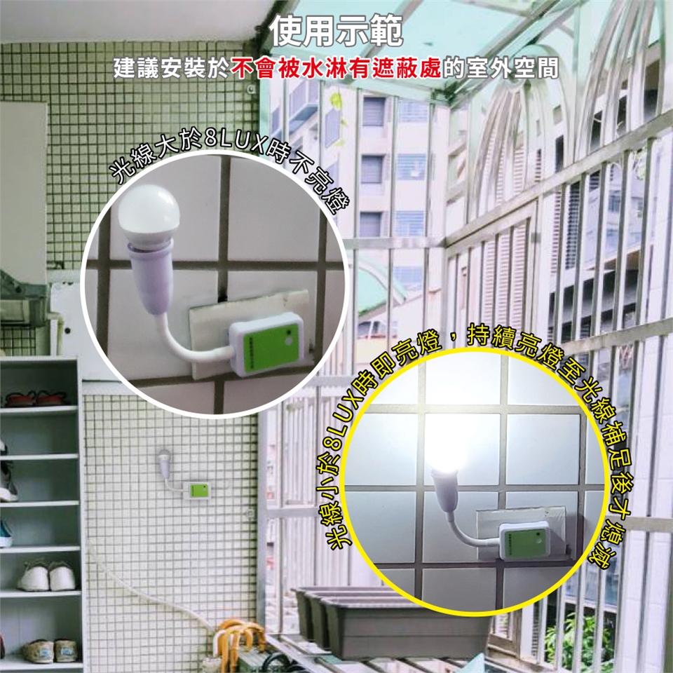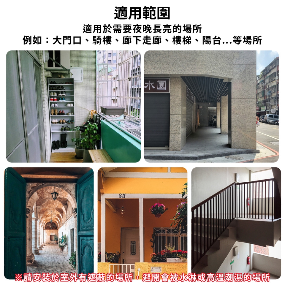 本產品可使用在:騎樓、大門口、室外走廊等地方,當黑夜或光線不足時,燈泡自動亮燈並持續亮燈到白天或光線充足後才熄滅。