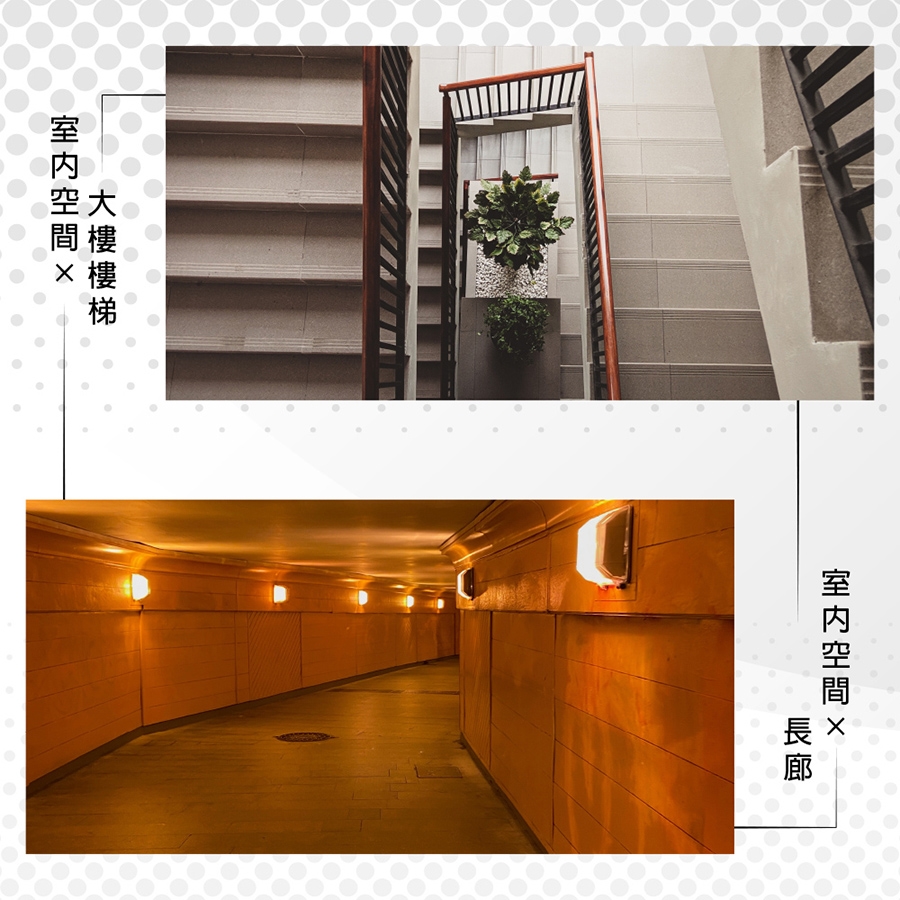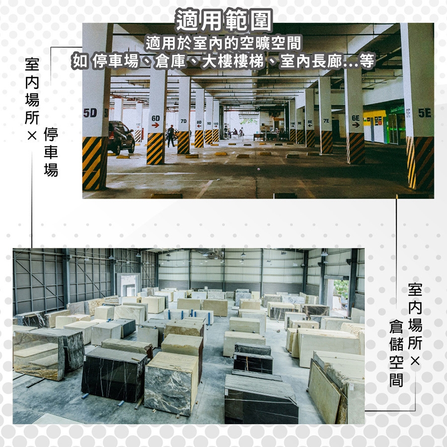 適用於公共場所、車庫、騎樓下、倉庫、樓梯間等場所。