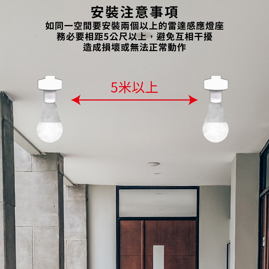 由於是主動感應於無阻擋的情況下如有兩個雷達感應開關或雷達感應燈,距離太近會互相干擾最好保持5米以上。