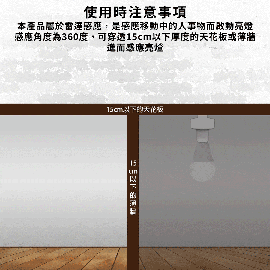 可以穿透非金屬材質感應,如玻璃、石膏板、木板、塑膠等等,小於15cm厚的牆體可能會穿透感應,且感應範圍360度非常靈敏。