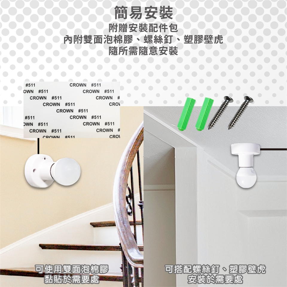 ●本產品附贈①泡棉雙面膠,可隨意黏貼固定,②塑膠壁虎、鑽孔釘、塞孔帽,可堅固固定於牆上或需要處。