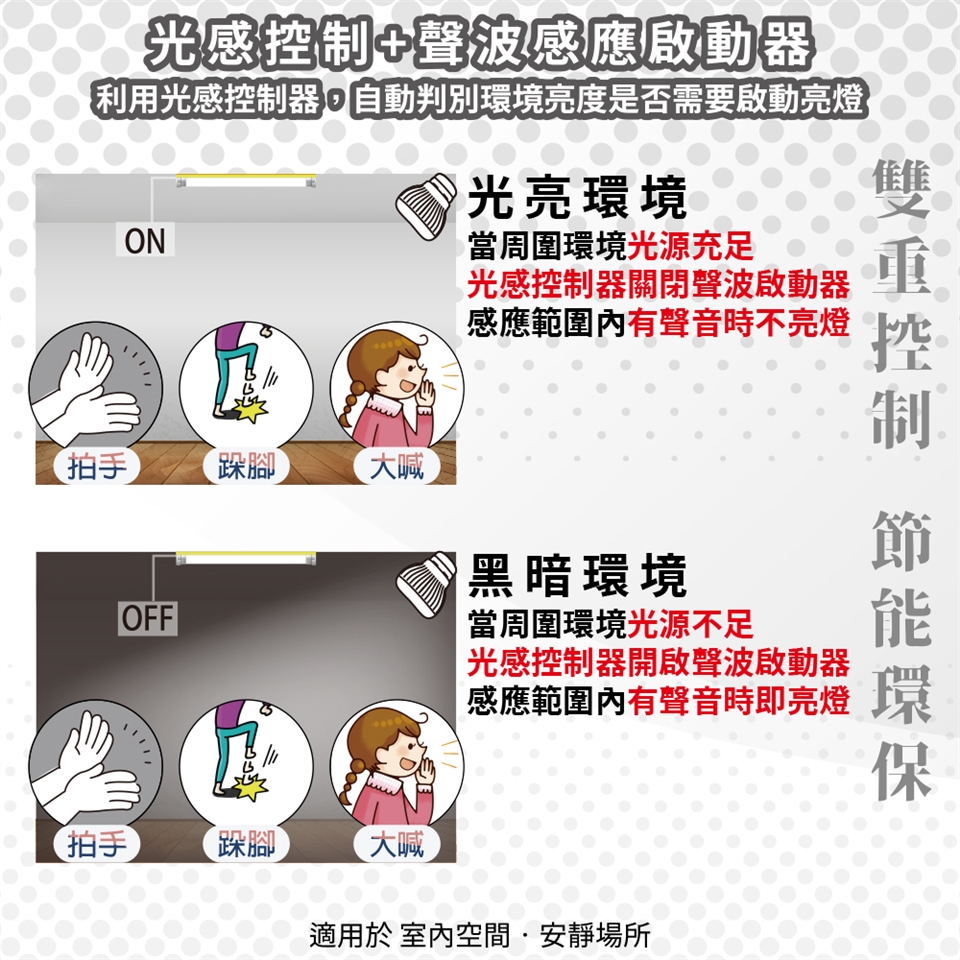 ●在晚上或光線比較暗時,拍手、跺腳、喊…的聲音都可以觸發開燈並沒有死角。
