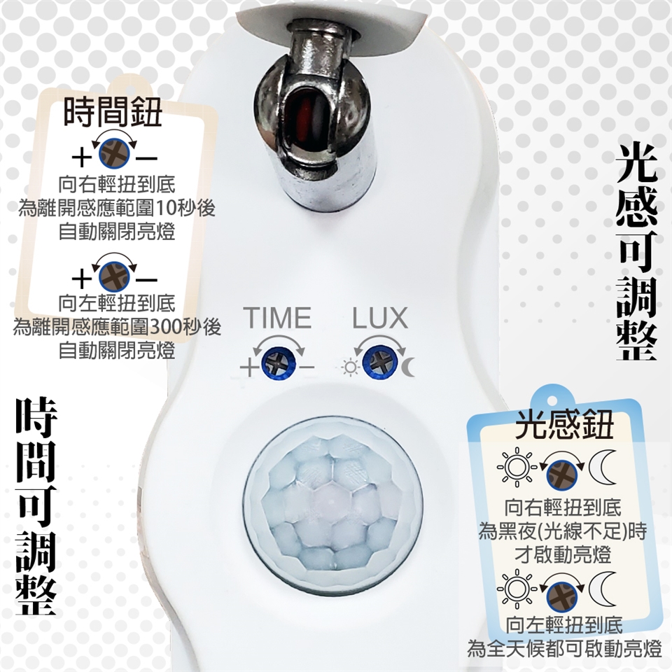 亮燈時間-有時間調整鈕,亮燈時間可調+-,可調時間範圍約10秒~120秒。