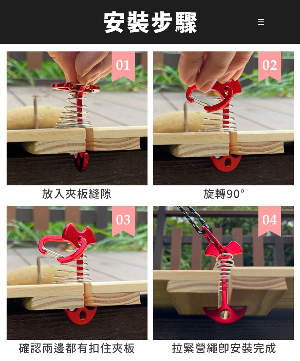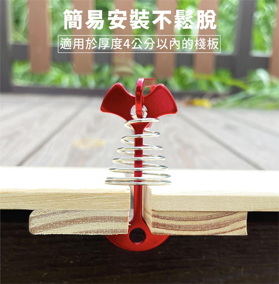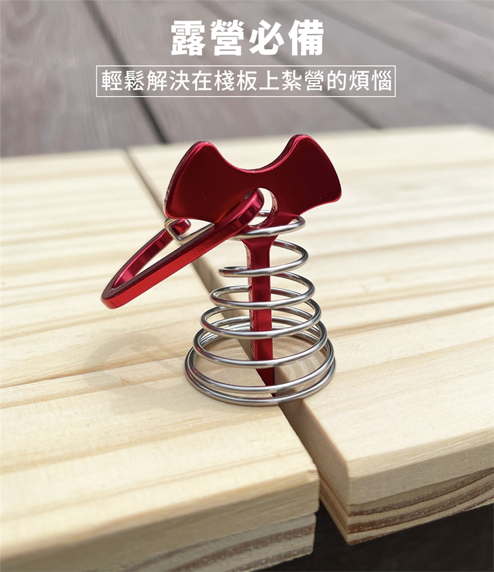搭配營區的棧板或是棧道使用,不銹鋼彈簧防止帳篷晃動導致地釘脫落