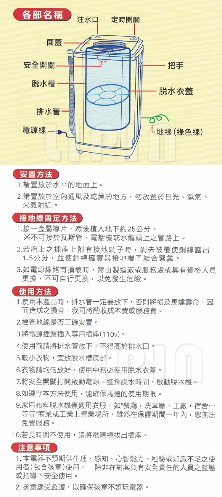 ◆本脫水機僅供家庭脫乾衣物使用,如馬達不當使用,或連續過量使用者,(需提供維修費用)