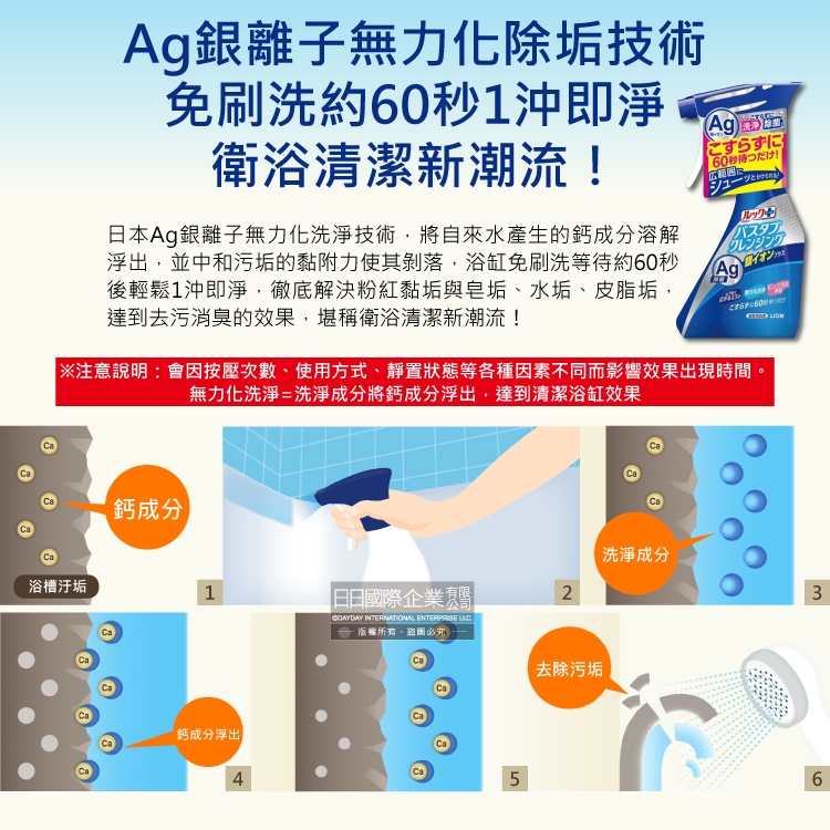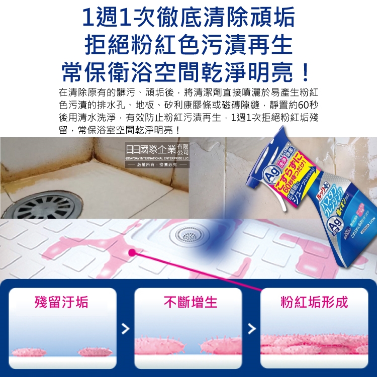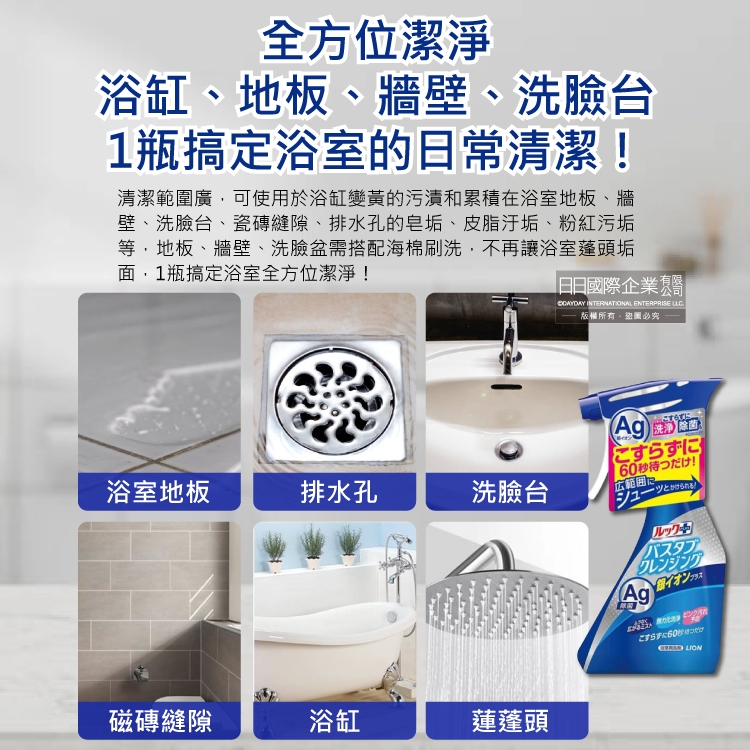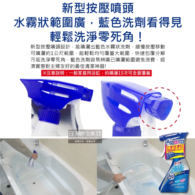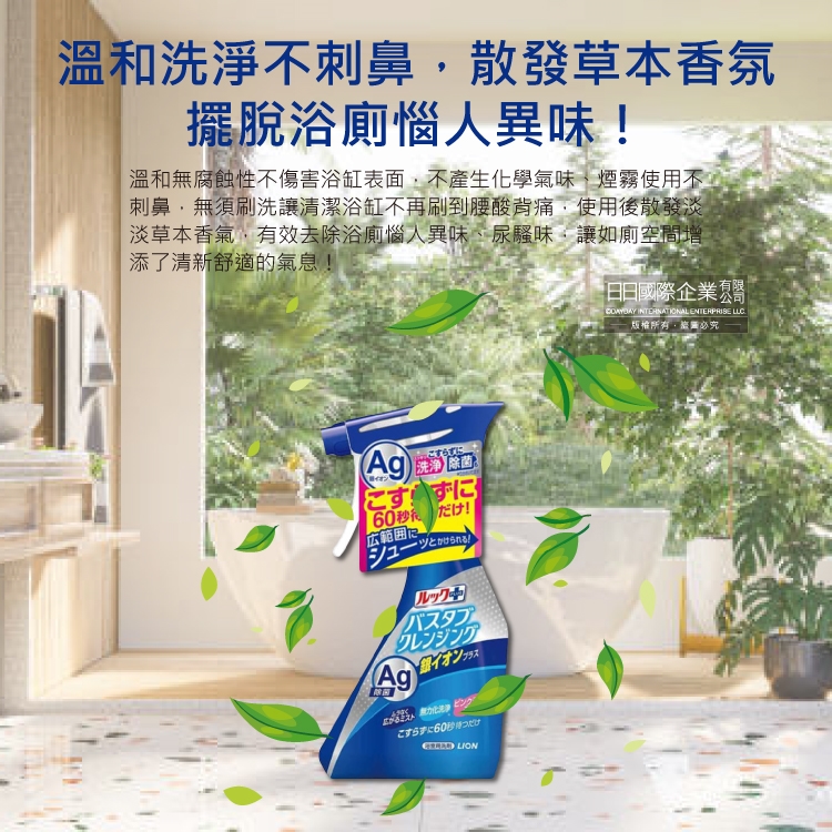 ●品名:LOOK PLUS免刷洗Ag銀離子去除粉紅色污垢浴缸噴霧清潔劑