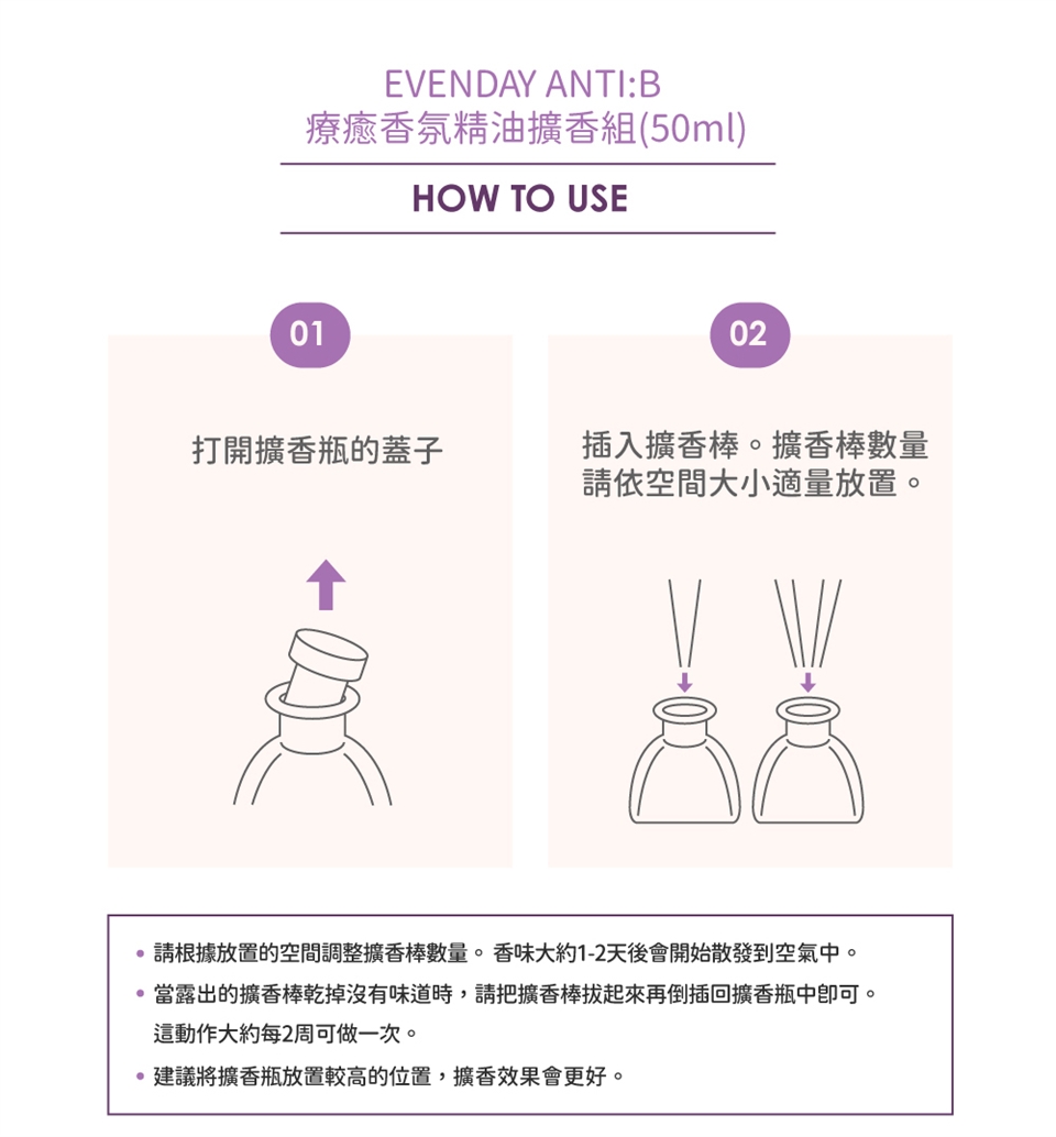 1.打開瓶蓋,將木條置入瓶中。2.為達到最佳擴香效果,請留意每星期將木條上下調換置入瓶中。3.芳香效果最長可持久達六個月。