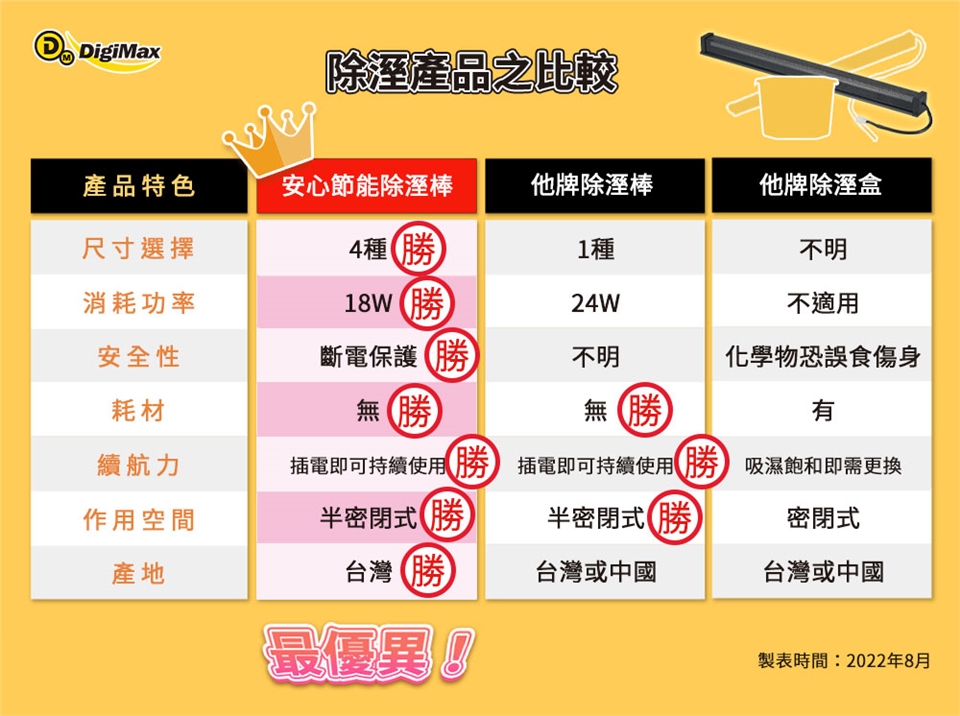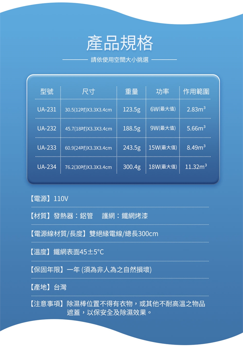 ●除溼棒安裝位置不得有衣物或其他不耐高溫之物品遮蓋,以確保安全及除溼效果。