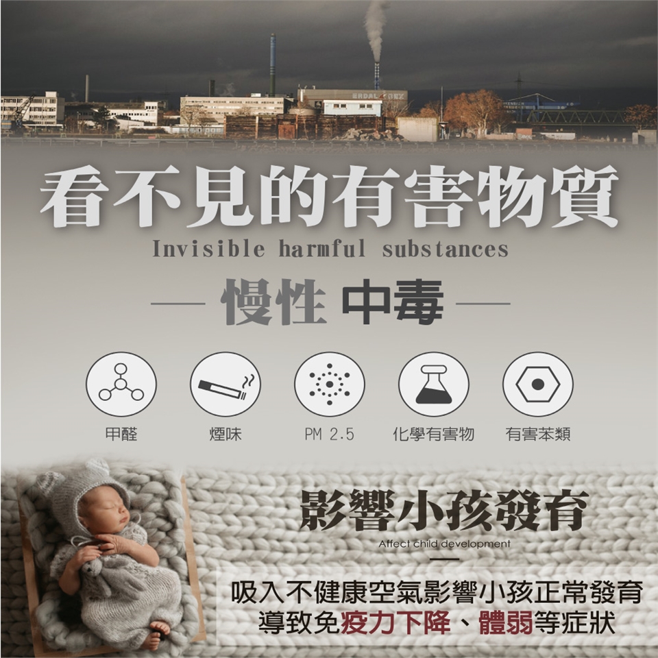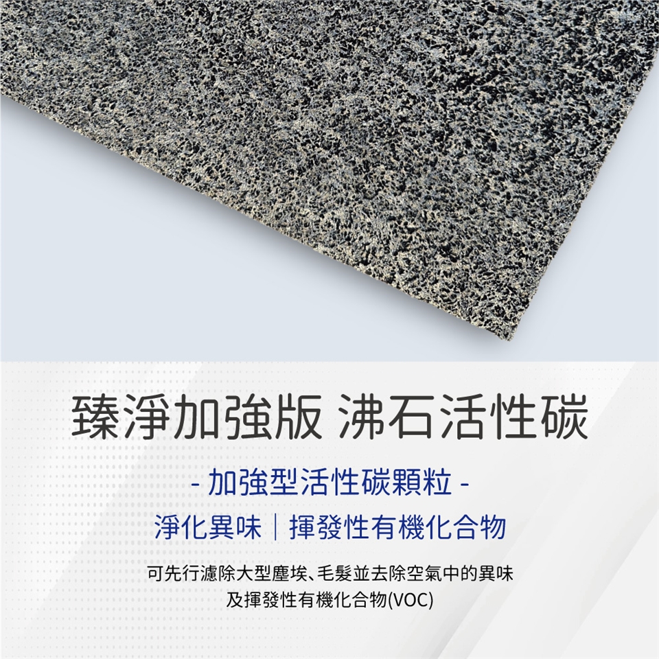 功效:可先行濾除大型塵埃、毛髮並去除空氣中的異味及揮發性有機化合物(VOC)