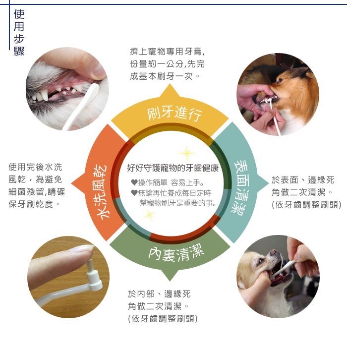 牙刷可以二面使用,配合想使用的部位確實的幫愛犬刷牙。