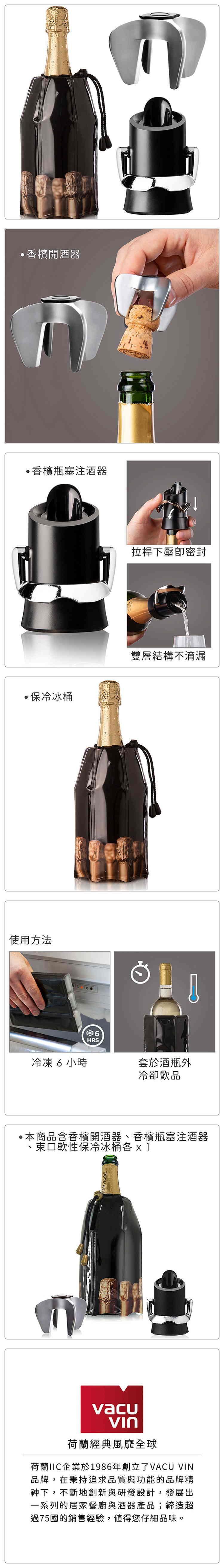 放鬆時想好好品嚐香檳等氣泡酒,卻又擔心一次喝不完,此款酒器組可助您從開酒、注酒、保冰到存放酒水,輕鬆享受香醇酒感。爪型香檳開酒器可固定夾穩軟木塞,緩慢斜推軟木塞頭,待瓶內氣體釋出即可拔出;香檳瓶塞注酒器回流不滴落注酒口,搭配酒塞功能讓您品酒後可迅速密封;束口保冷冰桶使品嚐美酒不再需要添加冰塊,即可享有沁涼的酒品,是享用美酒的推薦選擇。