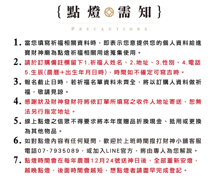 ※請於結帳時填,將點燈人資料『姓名、地址、出生年月日(農曆生日)』寫於「備註欄」內