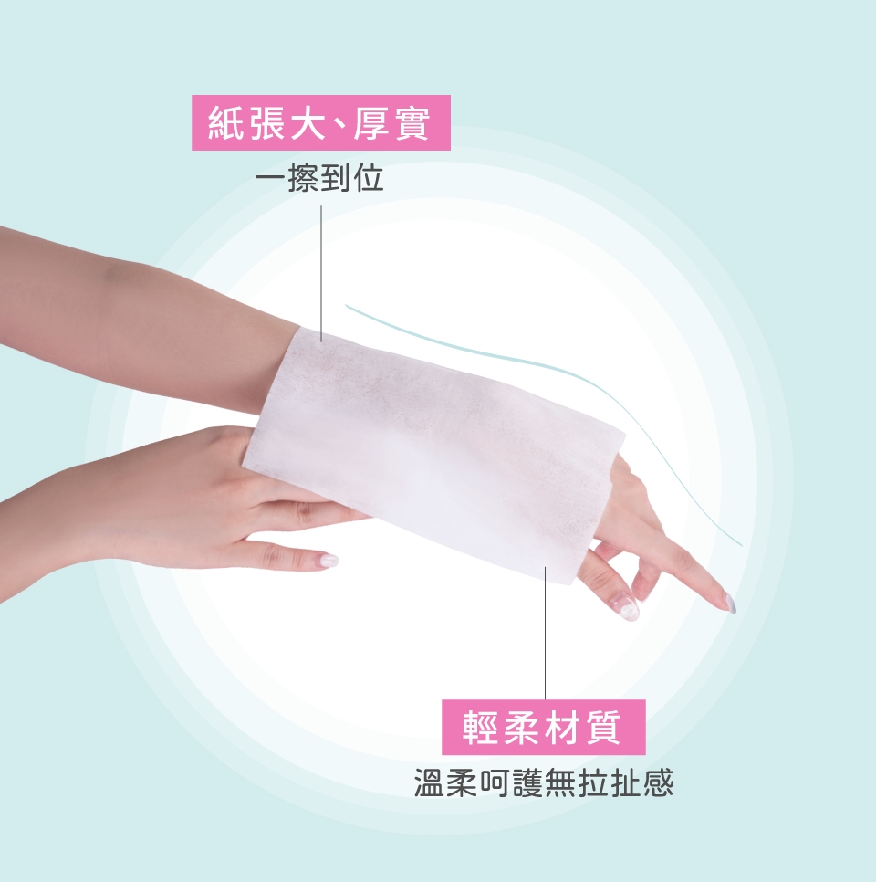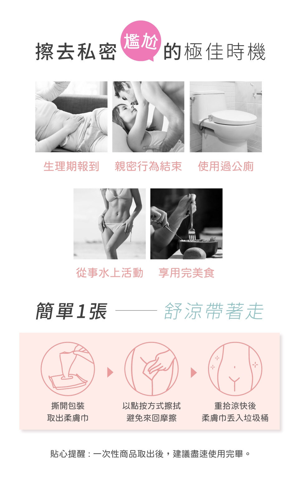 抽取紙巾,擦拭於私密肌膚,使用後立即丟棄於垃圾桶。