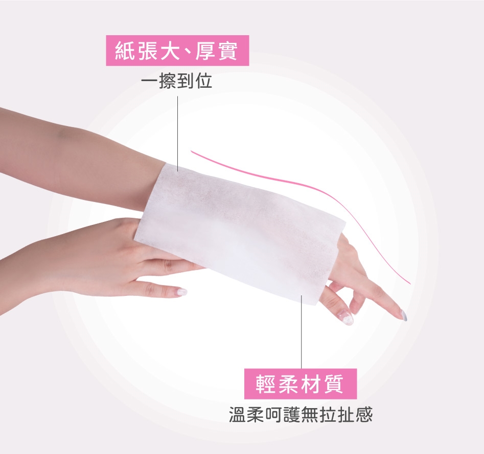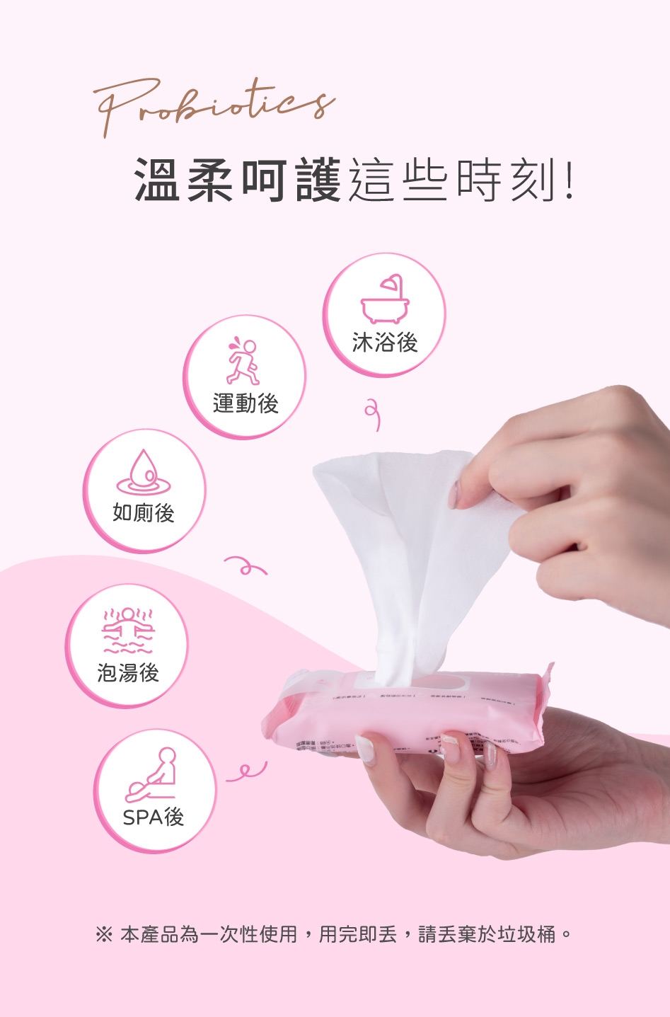 抽取紙巾,擦拭於私密肌膚,使用後立即丟棄於垃圾桶。