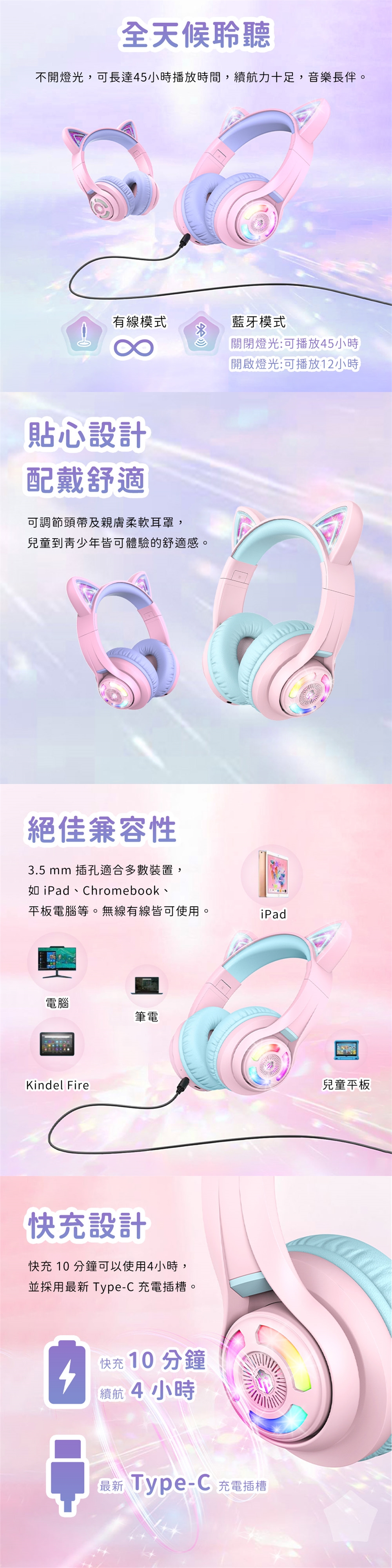 - LED燈光 |可愛貓耳造型,炫麗燈光效果