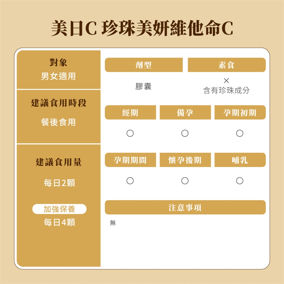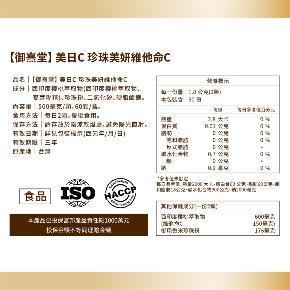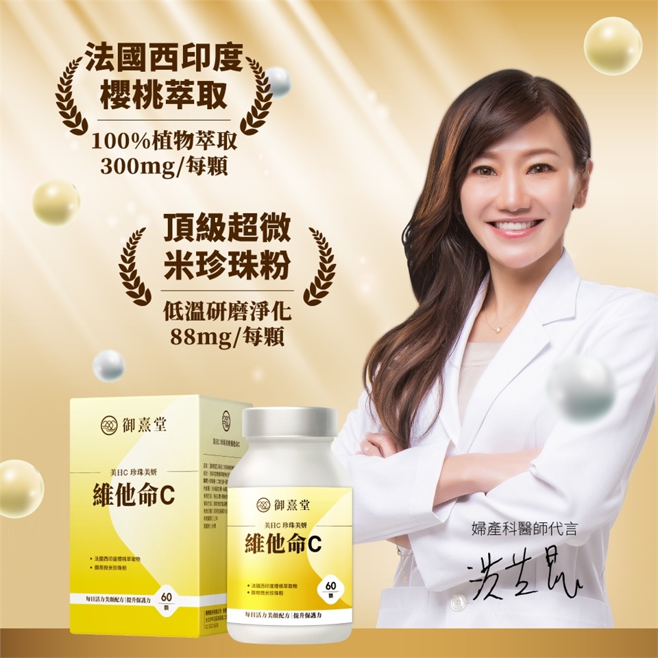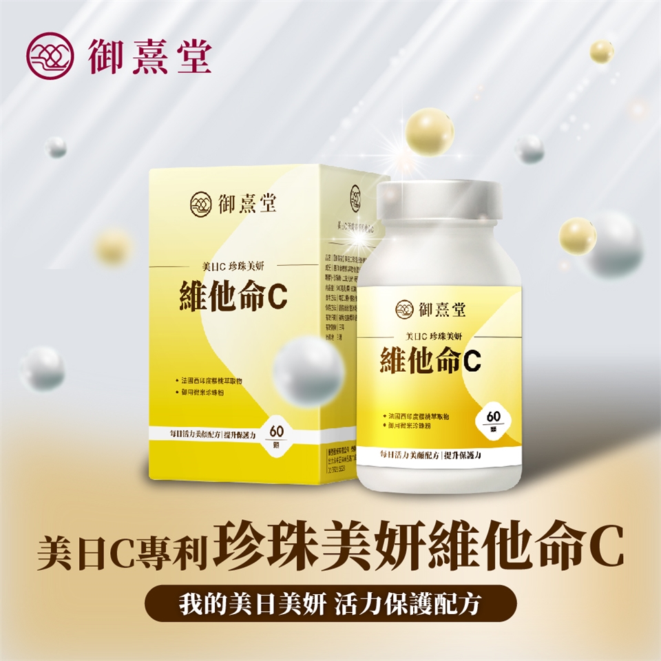 根據衛生署[國人膳食營養素參考攝取量DRIs],成人每天應攝取至少100毫克的維生素C。御熹堂®的美日C 珍珠美妍維他命C,每份含150毫克的天然維生素C,176毫克的微米珍珠粉。