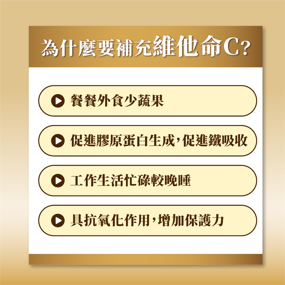 維生素C是人體所需非常重要的基礎營養素,具抗氧化作用,擁有強大的保護力,天天補充維生素C,可以讓你輕鬆擁有美麗好氣色、每天滿滿的青春活力!同時維生素C還是形成膠原蛋白的重要原料,可促進膠原蛋白的形成,有助於傷口癒合另外,維生素C還有助於維持細胞排列的緊密性,增進體內結締組織、骨骼及牙齒的生長。