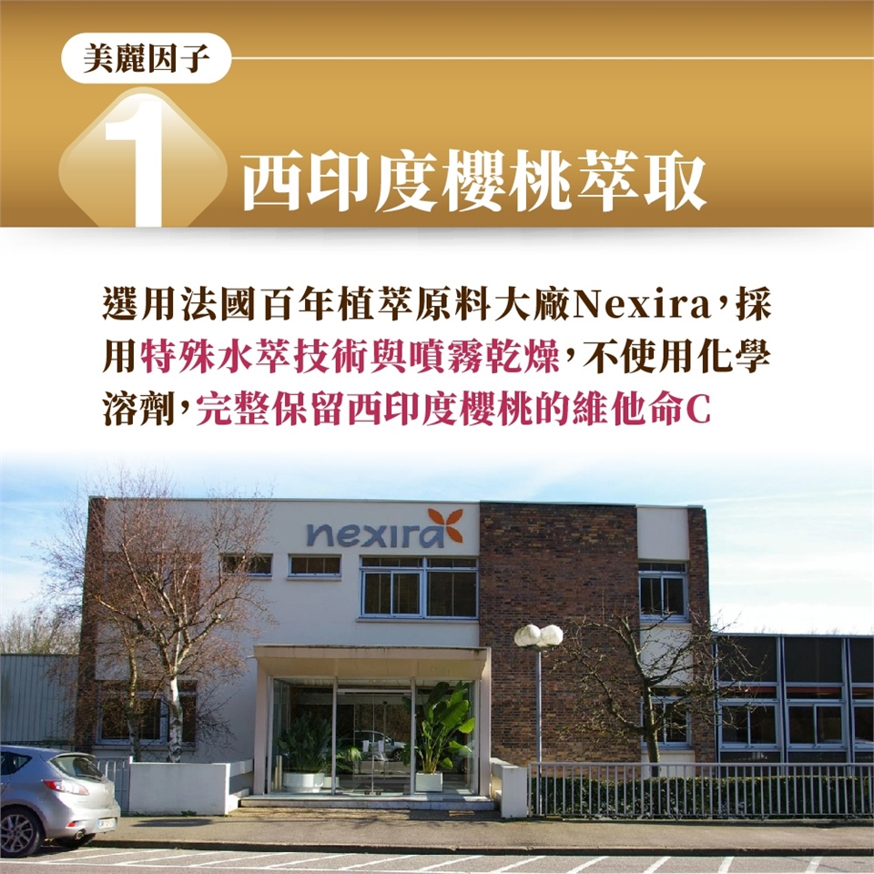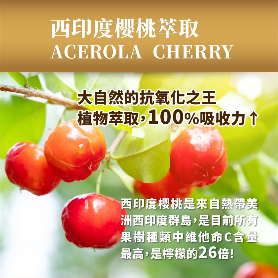選自全球最大西印度櫻桃的供應商之一法國品牌Nexira,來自純淨的巴西東北區,嚴選每顆維生素C含量最高的櫻桃。
