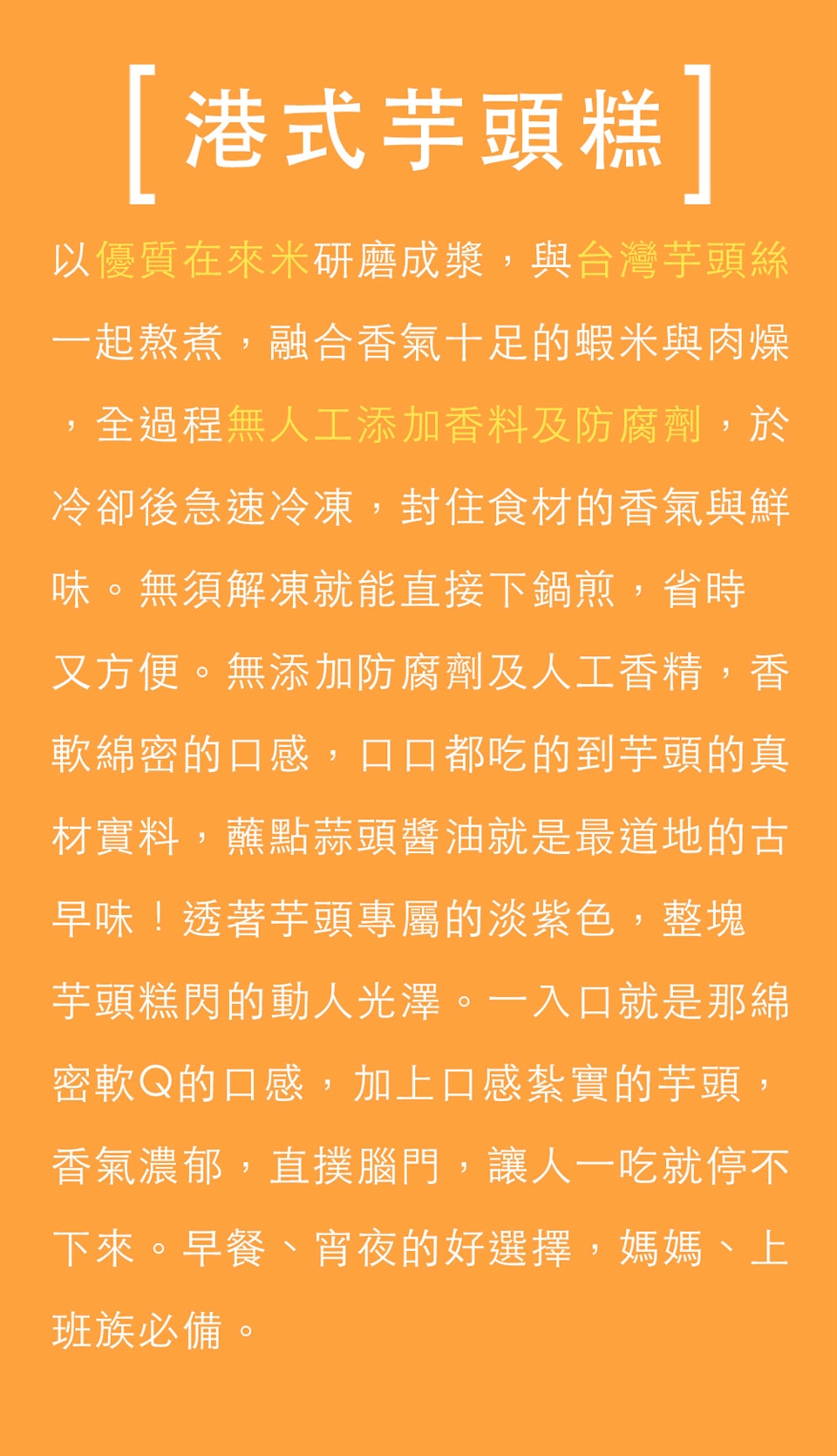 網購熱銷商品。港點中經典中的經典!現在不必跑到茶樓吃,在家就能吃到最讓人滿足的道地美味! 以優質在來米研磨成漿,與特選台灣白蘿蔔絲一起熬煮,融合香氣十足的蝦米與肉燥,全過程無人工添加香料及防腐劑,於冷卻後急速冷凍,封住食材的香氣與鮮味。 無須解凍就能直接下鍋煎,省時又方便。無添加防腐劑及人工香精,香軟綿密的口感,口口都吃的到蘿蔔的真材實料,蘸點蒜頭醬油就是最道地的古早味! 早餐、宵夜的好選擇,媽媽、上班族必備。