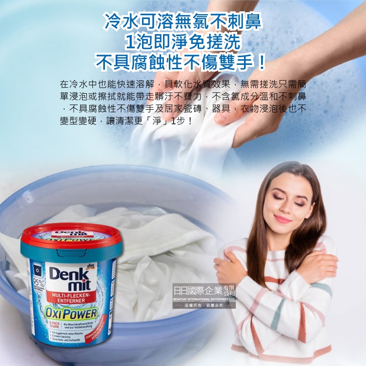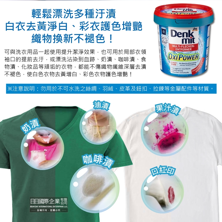 (2)將有汙漬的衣物浸入水中,浸泡完後正常洗滌即可。(有色衣物最多浸泡約1小時;有頑固汙漬的白色衣物可放置過夜)