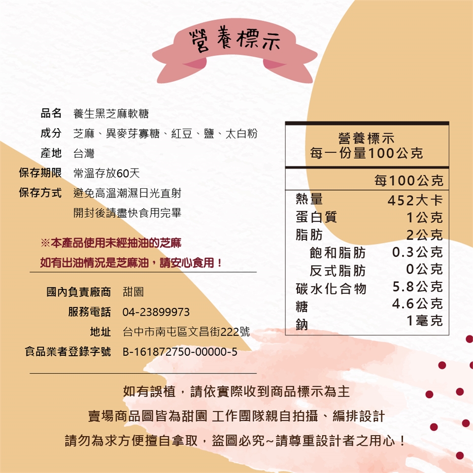 100%黑芝麻使用,以寡糖取代蔗糖、麥芽糖