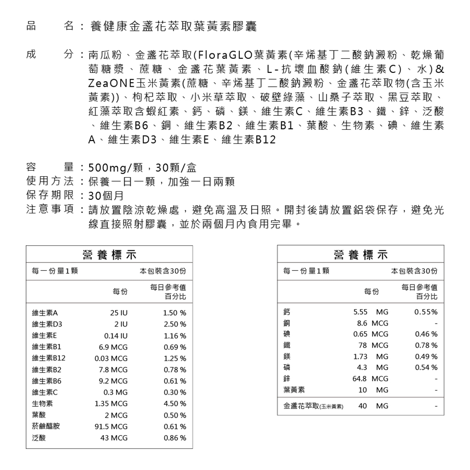 2. 商品品名:金盞花萃取葉黃素膠囊