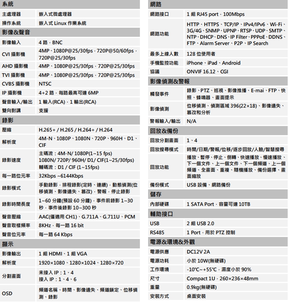 支援 4 路 影像輸入 AHD/TVI/CVI/960H/D1 多種訊號可選